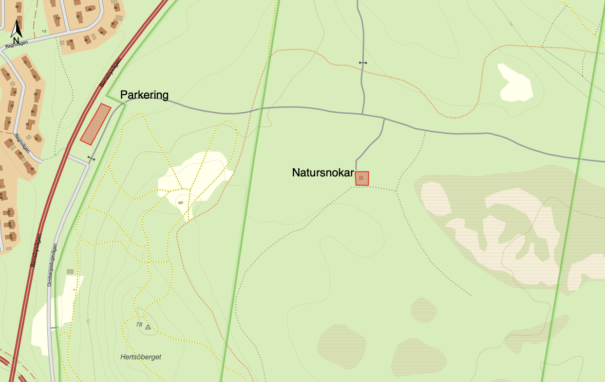 Kom till Ormbergets nedre parkering, direkt till vänster där man svänger in från Bensbyvägen. Därifrån följer ni snokbilder till stora rastplatsen. Se bild nedan.