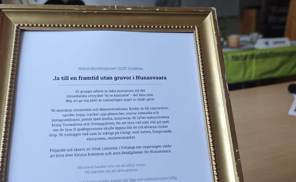 Naturskyddspriset 2025 delas ut till gruppen som jobbar för en framtid i Nunasvaara utan gruvor. Deras arbete är raka motsatsen till det tornedalska uttrycket “ei se kannatte” – det löns inte. Nej, att ge sig platt är sannerligen inget de tänkt göra.